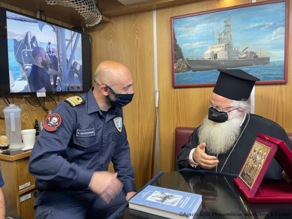 Ο Κυβερνήτης κ. Λεονταράκης ξενάγησε τον Σεβ. και τον ευχαρίστησε για την επίσκεψη και την ευλογητική παρουσία του στο σκάφος. Δήλωσε εντυπωσιασμένος από την επίσκεψή του στην ιστορική Μονή Τοπλού, αλλά και από την φιλοξενία και την αγάπη των ανθρώπων της Σητείας. Η αποδοχή και ο ενθουσιασμός των απλών ανθρώπων μας δίνει κουράγιο και δύναμη να συνεχίσουμε το επίπονο έργο μας, τόνισε χαρακτηριστικά.