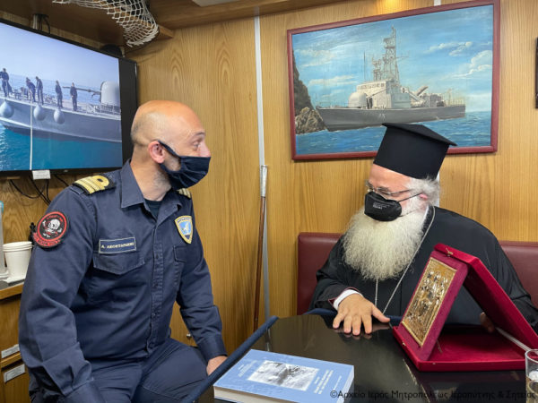 Μετά την ανταλλαγή αναμνηστικών δώρων, ο Σεβ. συνεχάρη τον κ. Λεονταράκη για την παρουσία του σκάφους στην όμορφη και ακριτική Σητεία και του ευχήθηκε ο Αναστάς Κύριος με τις πρεσβείες της προστάτιδος της Σητείας Αγίας Αικατερίνας να ενισχύει τον ίδιο και όλα τα μέλη του πληρώματος, για να βρίσκονται πάντοτε στην πρώτη γραμμή του καθήκοντος υπεράσπισης των θαλασσίων συνόρων της πατρίδας μας σε καιρούς δύσκολους και κρίσιμους για το Έθνος μας. Η παρουσία σας στην ιστορική Σητεία, πλημμυρίζει όλους τους κατοίκους και τους επισκέπτες αυτής της ευλογημένης γωνιάς της Πατρίδας μας με αισθήματα ασφάλειας και υπερηφάνειας. Χαιρόμαστε που σας επισκεπτόμαστε και σας διαβεβαιώνουμε ότι και προσευχόμαστε στον Κυβερνήτη του κόσμου και Δημιουργό Τριαδικό Θεό για τις ζωές και το δύσκολο έργο σας, επεσήμανε ο Σεβ. κ. Κύριλλος.