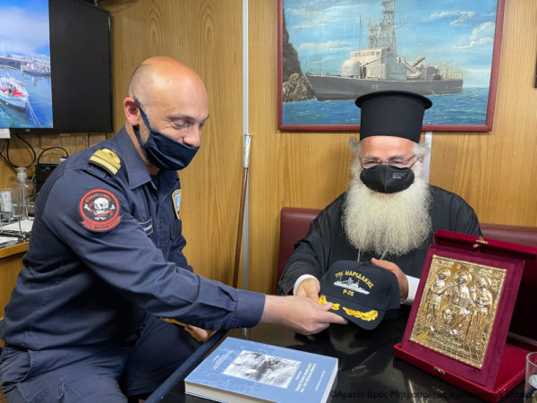 Ο Σεβ., συνοδευόμενος από τον Πρωτοσύγκελλο της Μητροπόλεως και Ηγούμενο της Μονής Τοπλού Αρχιμ. Αμβρόσιο Σκαρβέλη και τον Αιδεσ. πρωτ. Νικόλαο Παθιάκη, ιερατικώς προϊστάμενο του Ι. Καθεδρικού Ναού Αγίας Αικατερίνης Σητείας, έγινε δεκτός εγκάρδια από τον Κυβερνήτη της Πυραυλάκατου Πλωτάρχη Αναστάσιο Λεονταράκη, τον Ύπαρχο και Μέλη του πληρώματος.