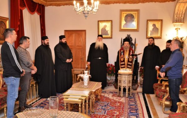 Παρόντες ήταν ο Πρωτοσύγκελλος Παν. Αρχιμ. π. Ιγνάτιος Ριγανάς, ο Γενικός Αρχιερατικός Επίτροπος Παν. Αρχιμ. π. Δωρόθεος Ζέρβας, οι Εφημέριοι του Μητροπολιτικού Ιερού Ναού Αγίου Στεφάνου Αρναίας Παν. Αρχιμ. π. Παίσιος Σουλτανικάς και Αιδ. Οικ. π. Γεώργιος Τρικκαλιώτης,ο Διάκονος π. Αμφιλόχιος Χάιτας, οι συνεργάτες του Σεβασμιωτάτου στα Γραφεία κ.κ. Πέτρος Κοτρότσιος, Γεώργιος Αρβανίτης και Κοσμάς Ζαμπούνης και ο υπεύθυνος της ιστοσελίδος της Μητροπόλεως κ. Δημήτριος Κατσάγγελος.