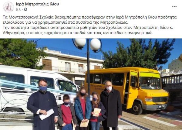 Τα Μοντεσσοριανά Σχολεία Βαρυμπόμπης προσέφεραν στην Ιερά Μητρόπολη Ιλίου ποσότητα ελαιολάδου για να χρησιμοποιηθεί στα συσσίτια της Μητροπόλεως.