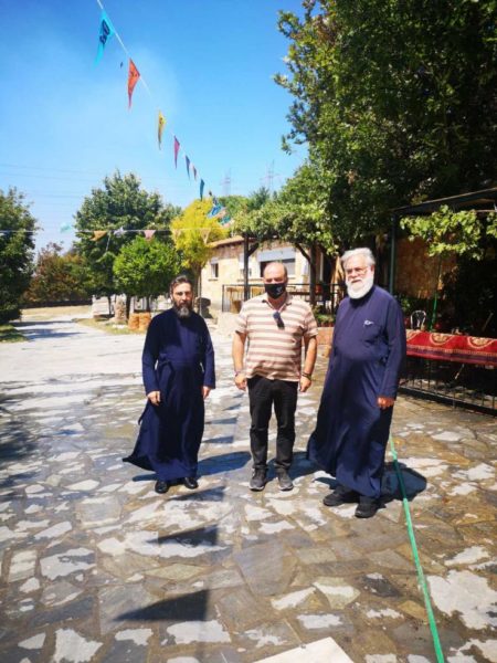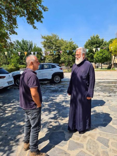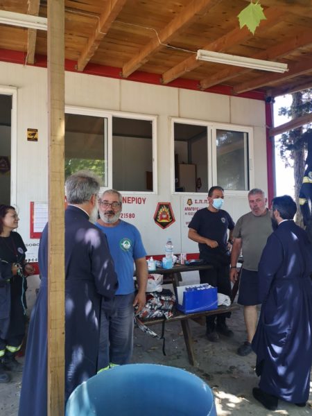 Στη συνέχεια, βρέθηκε στο φυλάκιο της πυροσβεστικής, όπου συνομίλησε με πυροσβέστες και εθελοντές πυροσβέστες που εκείνη την ώρα βρίσκονταν στη βάρδια, τους ευλόγησε και τους ευχαρίστησε θερμά για την μέχρι τώρα προσφορά και το έργο τους.