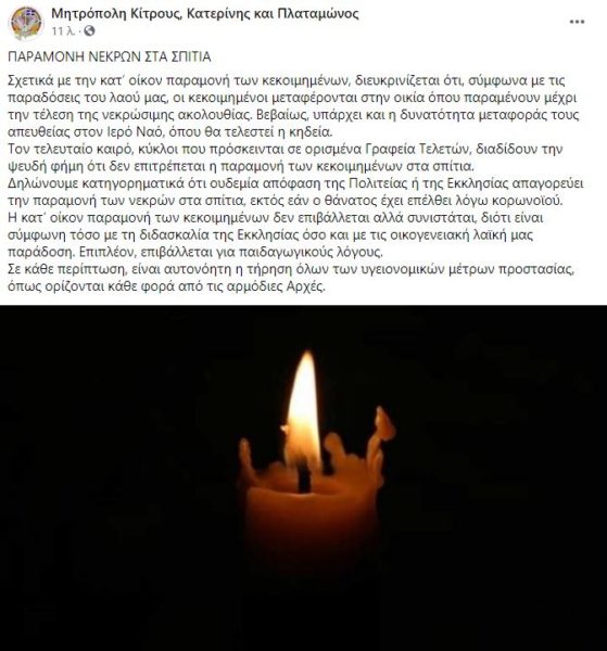 Ανακοίνωση σχετικά με την κατ’ οίκον παραμονή των κεκοιμημένων στα σπίτια, εξέδωσε η Ιερά Μητρόπολη Κίτρους. Όπως διευκρινίζει ότι “σύμφωνα με τις παραδόσεις του λαού μας, οι κεκοιμημένοι μεταφέρονται στην οικία όπου παραμένουν μέχρι την τέλεση της νεκρώσιμης ακολουθίας. Βεβαίως, υπάρχει και η δυνατότητα μεταφοράς τους απευθείας στον Ιερό Ναό, όπου θα τελεστεί η κηδεία”.