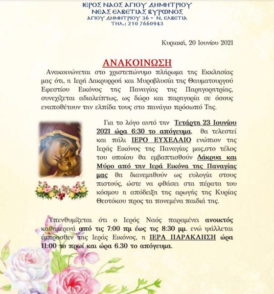 Η Ιερός Ναός Αγίου Δημητρίου Νέας Ελβετίας της Ιεράς Μητροπόλεως Καισαριανής, Βύρωνος και Υμηττού ανακοινώνει πως η Ιερή Δακρυρροή και Μυροβλυσία της Θαυματουργού Εφεστίου Εικόνας της Παναγίας της Παρηγορήτριας συνεχίζεται αδιαλείπτως. Για το λόγο αυτό, την Τετάρτη 23 Ιουνίου, θα τελεστεί και πάλι το μυστήριο του ιερού ευχελαίου ενώπιον της Ιεράς Εικόνος της Παναγίας από την οποία και θα εμβαπτιστούν δάκρυα και μύρο, τα οποία θα διανεμηθούν στους πιστούς προς ευλογία.