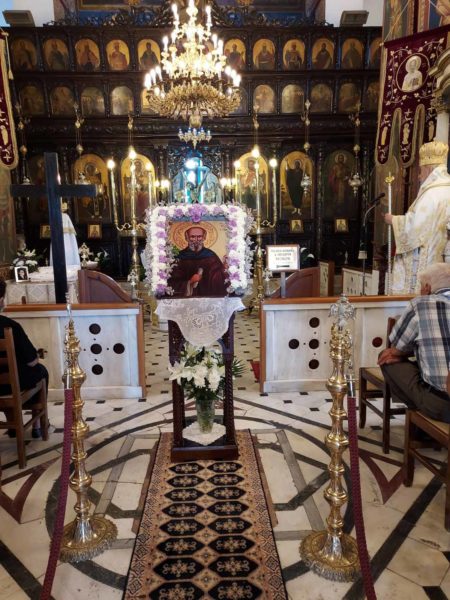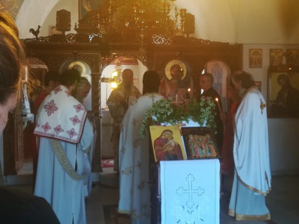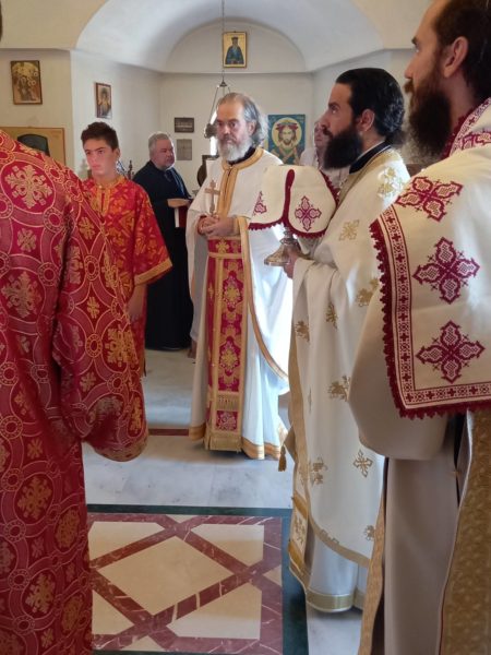 Κατόπιν άδειας και ευλογίας του Σεβασμιωτάτου Μητροπολίτου Καρυστίας και Σκύρου κ. Σεραφείμ ιερούργησε ο εκ του Οικουμενικού Πατριαρχείου Σεβασμιώτατος Μητροπολίτης Ειρηνουπόλεως κ. Νίκανδρος με συλλειτουργούς τον Πανοσ. Αρχιμ., άγοντα την ονομαστική εορτή, π. Γεράσιμο Παρίση, και τον Πανοσ. Αρχιμ. Πορφύριο Γιαννάκη, τον Πανοσ. Αρχιμ. Νεκτάριο Καπενή, τον Πρωτοπρ. Πέτρο Κρίσιλια, εφημέριο του ιερού ναού και τον διάκονο.