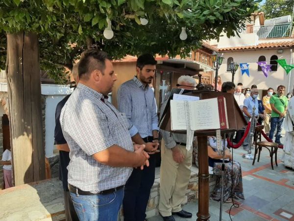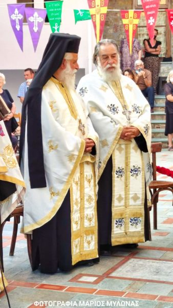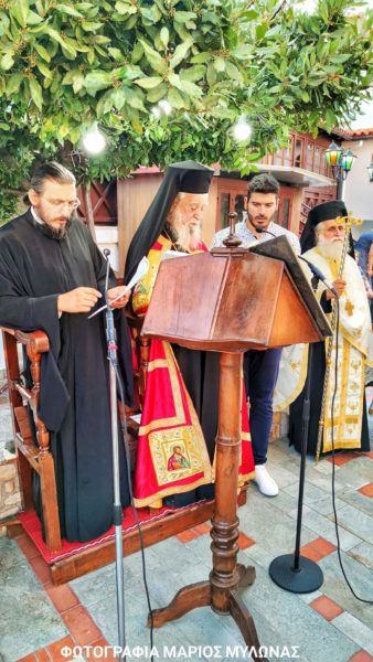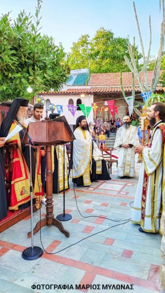Στον Πανηγυρικό Εσπερινό χοροστάτησε ο Σεβασμιώτατος Μητροπολίτης Καρυστίας και Σκύρου κ. Σεραφείμ πλαισιούμενος από τον Πανοσ. Αρχιμ. Χριστόφορο Νάνο, εφημέριο του Ιερού Ναού της Κοιμήσεως της Θεοτόκου “Παναγίτσα Παλαιού Φαλήρου” της Ιεράς Μητροπόλεως Νέας Σμύρνης, τον Γενικό Αρχιερατικό Επίτροπο Πρωτοπρ. Ελευθέριο Σταμπέλο και τους διακόνους Στυλιανό Πεταχτή και Πρόδρομο Γκέγκε.