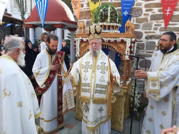 Ο Σεβασμιώτατος κήρυξε τον Θείο Λόγο, ευχήθηκε στους πιστούς και προέστη των Εγκωμίων επί του Επιταφείου της Παναγίας. Τους ύμνους απέδωσε ο Σεβασμιώτατος με τον διάκονο Αναστάσιο Σταματίου και τον αυτάδελφό του, Γεώργιο Σταματίου, εκ Κληματαρίου Οξυλίθου.