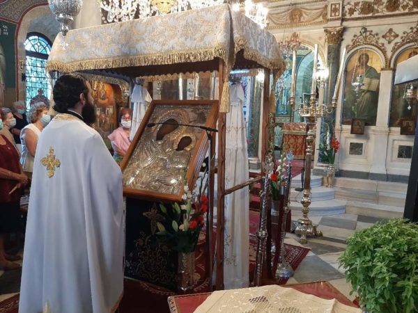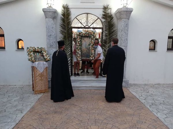 Ακολούθως ο Σεβασμιώτατος κ. Νίκανδρος προέστη μετα των ιερέων και ιεροψαλτών της μικράς και συντόμου λιτανείας της ιεράς εικόνος πέριξ του ιερού ναού άνευ συμμετοχής των πιστών λόγω των υγειονονικών διατάξεων.
