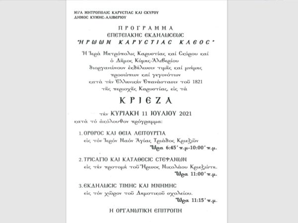 Συμμετέχοντας στον εορτασμό για την επέτειο των 200 χρόνων από την ελληνική επανάσταση του 1821, η Ιερά Μητρόπολις Καρυστίας και Σκύρου και ο Δήμος Κύμης- Αλιβερίου διοργανώνουν εκδήλωση με θέμα «Ηρώων Καρυστίας Κλέος».