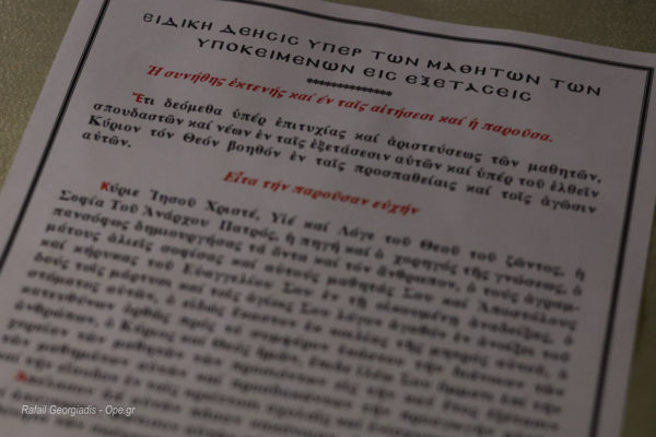 Πριν από την απόλυση της Θείας Λειτουργίας πραγματοποιήθηκε δέηση και αναγνώστηκε από τον Σεβασμιώτατο η ευχή υπέρ επιτυχίας και αριστεύσεως των μαθητών, σπουδαστών και νέων τις επικείμενες πανελλαδικές εξετάσεις.