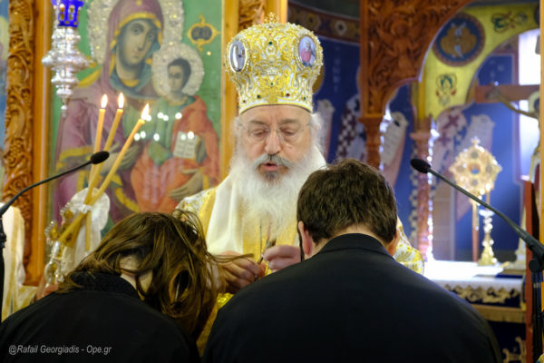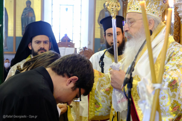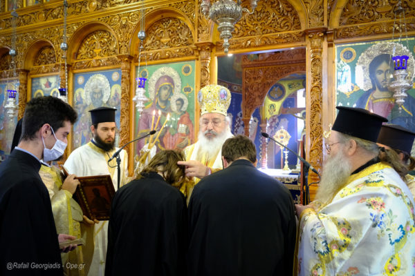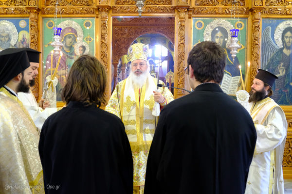 Στο τέλος της Θ. Λειτουργίας, χειροθέτησε σε αναγνώστες 2 μαθητές της ενορίας του Αγίου Νικολάου Πολυγύρου, διδοντάς τους την ευλογία να διακονούν το ιερό αναλόγιο, το μεγάλο αυτό σπουδαστήριο της Εκκλησίας και το ιερό βήμα.