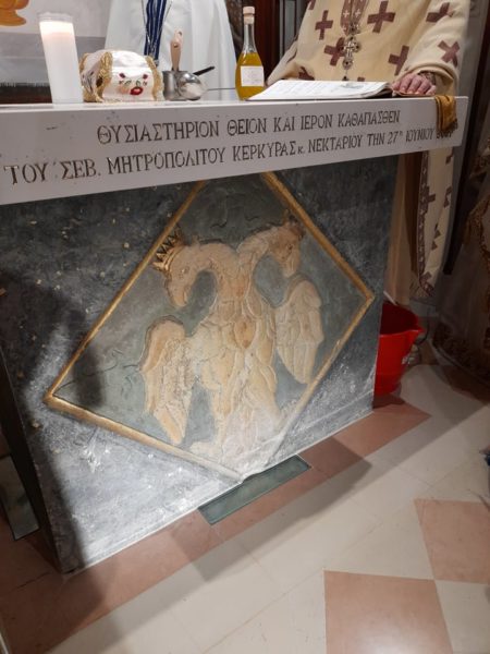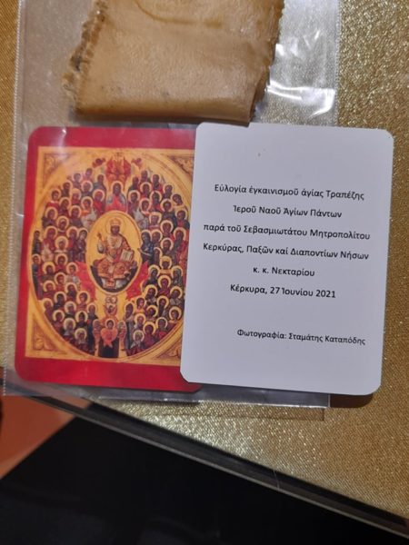Στον πανηγυρίζοντα Ιερό Ναό Αγίων Πάντων Κέρκυρας λειτούργησε το πρωί της Κυριακής 27 Ιουνίου 2021 ο Σεβασμιώτατος Μητροπολίτης Κερκύρας, Παξών και Διαποντίων Νήσων κ. Νεκτάριος. Ο κ. Νεκτάριος τέλεσε και την ακολουθία επί διασαλεύσει της αγίας Τραπέζης του ιερού ναού, μετά την ολοκλήρωση των έργων ανακαίνισής του και την εύρεση μπροστά στην παλαιά αγία τράπεζα μαρμάρινου ανάγλυφου δικέφαλου αετού, μοναδικού θέματος στην Ελλάδα.