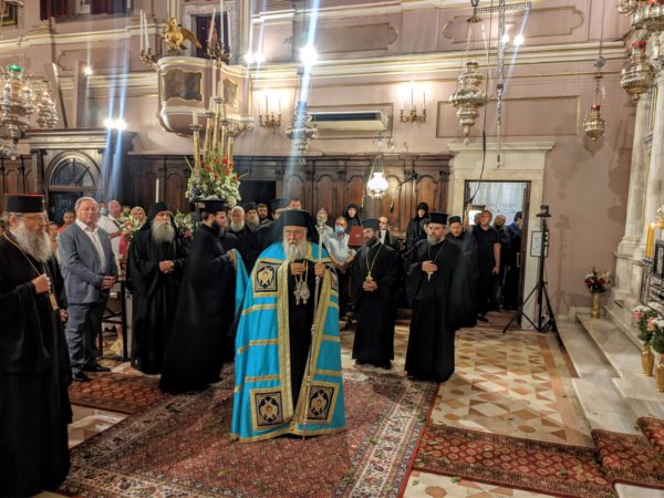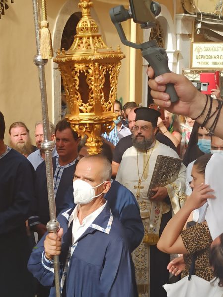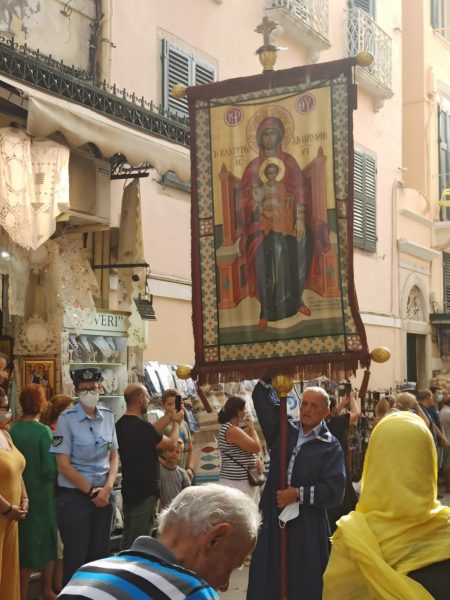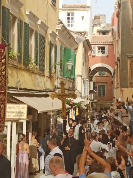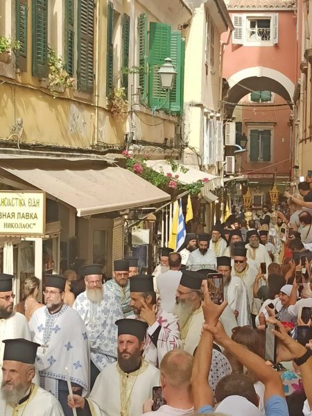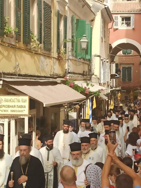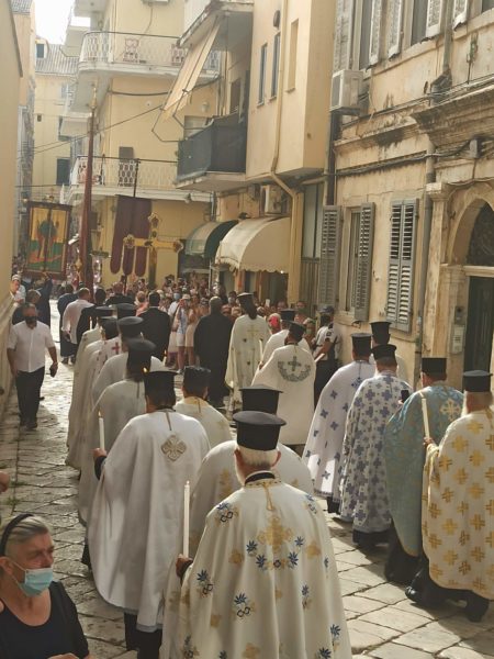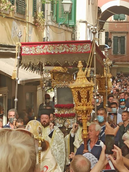 Μετά το πέρας της Θείας λειτουργίας έγινε μικρή περιφορά του Ιερού λειψάνου του Αγίου Σπυρίδωνος πέριξ του Ιερού προσκυνήματος και στην τοποθέτηση του εις την θύρα για τριήμερο προσκύνημα, πραγματοποιήθηκε ικετευτική δέηση για την κατάπαυση των πυρκαγιών και την απαλλαγή της ανθρωπότητας από τον πειρασμό της πανδημίας. Να σημειωθεί ότι κατά το τριήμερο προσκύνημα, θα τελούνται ιερές ακολουθίες και αγρυπνίες τηρώντας τα απαραίτητα μέτρα για την μη μετάδοση του κορωνοϊού.