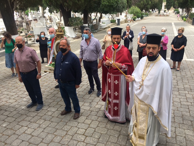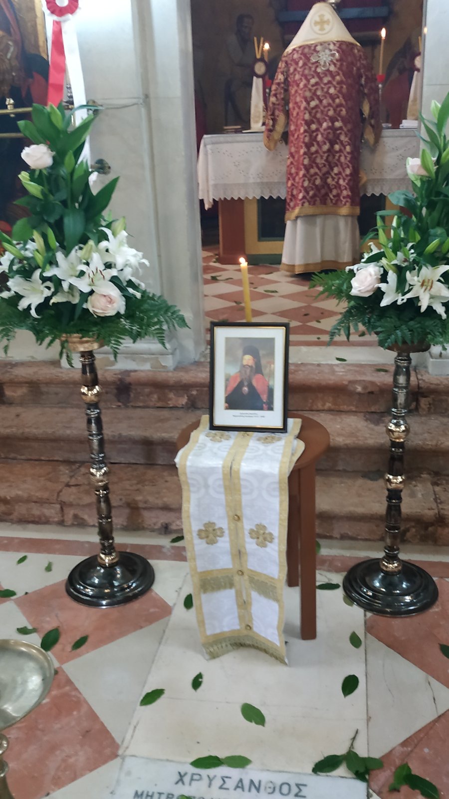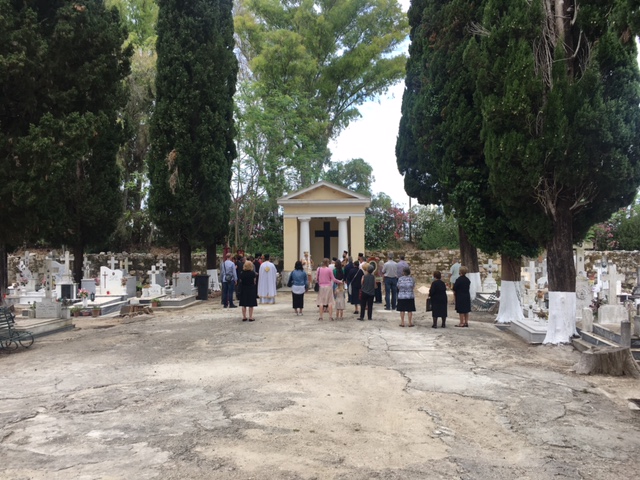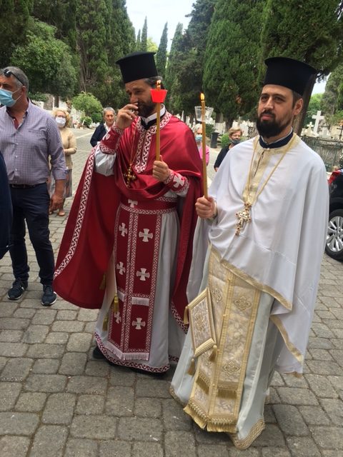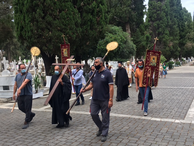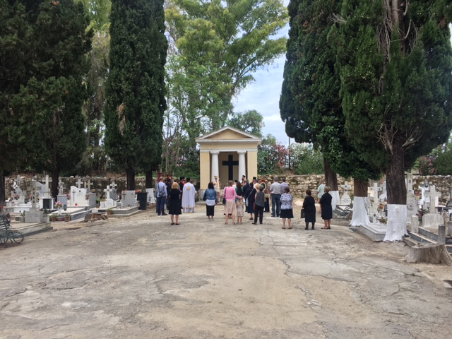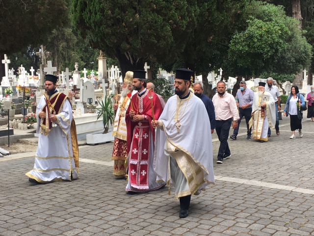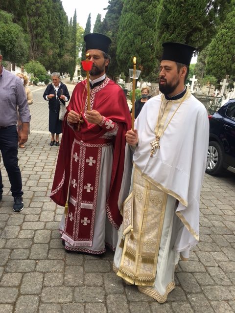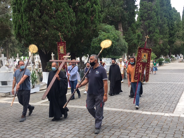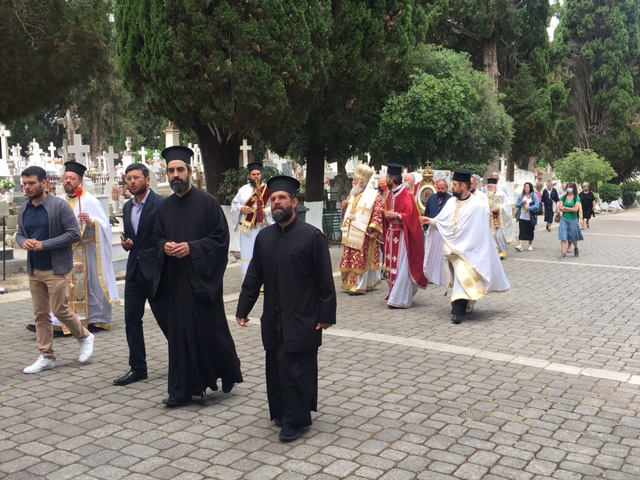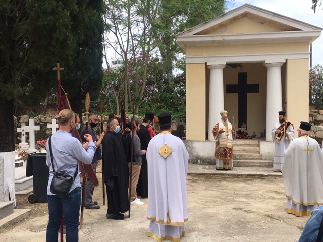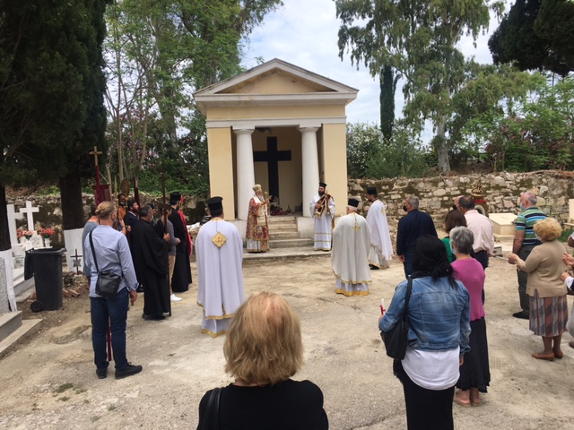 Στο πέρας της Θείας Λειτουργίας ο κ. Νεκτάριος τέλεσε τρισάγιο για την ανάπαυση των ψυχών των μακαριστών προκατόχων του Χρυσάνθου και Ευσταθίου, που είναι θαμμένοι εντός του ναού, όπως συνηθιζόταν στην Κέρκυρα, ενώ προεξήρχε μικρής περιφοράς της εικόνας της Αναστάσεως εντός του κοιμητηρίου και τέλεσε την απόλυση μπροστά από το κενοτάφιο του Αγίου Αρσενίου του Καππαδόκου, ο οποίος είχε κοιμηθεί και είχε ταφεί στην Κέρκυρα, μετά την ανταλλαγή των πληθυσμών ύστερα από την Μικρασιατική καταστροφή.