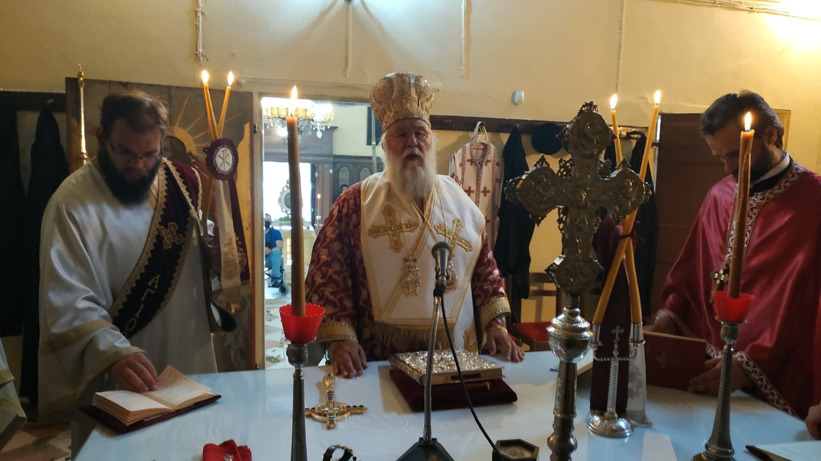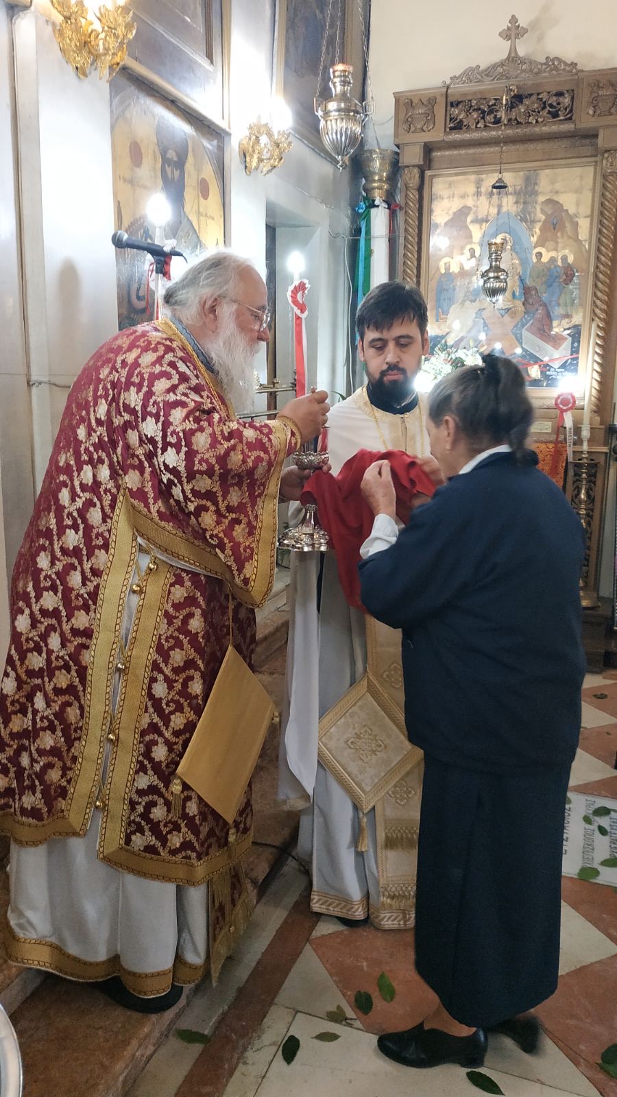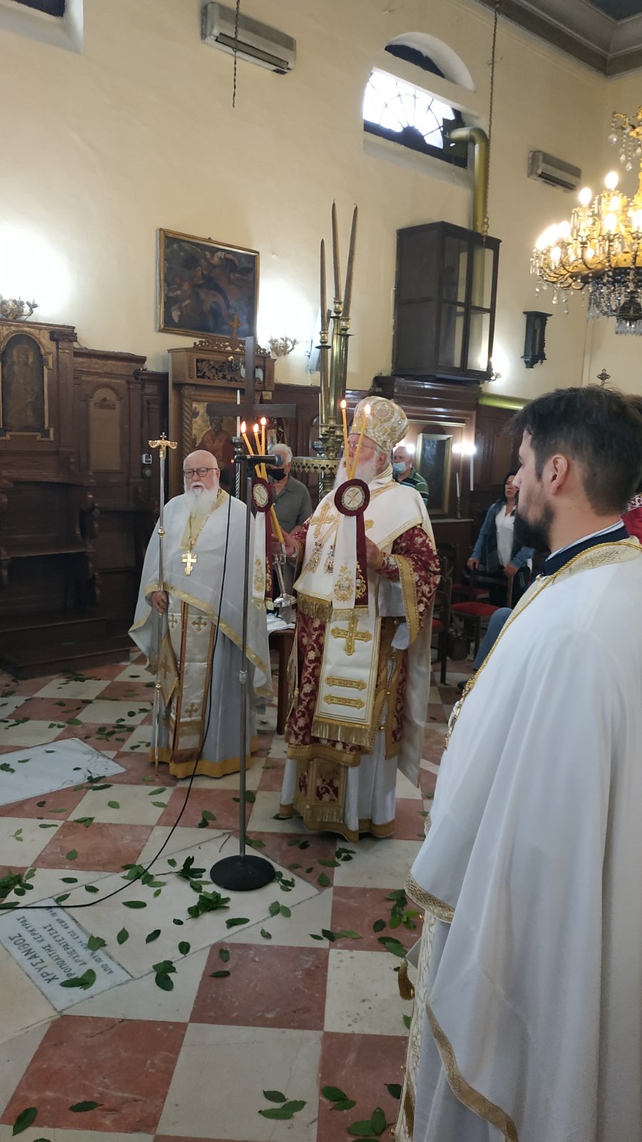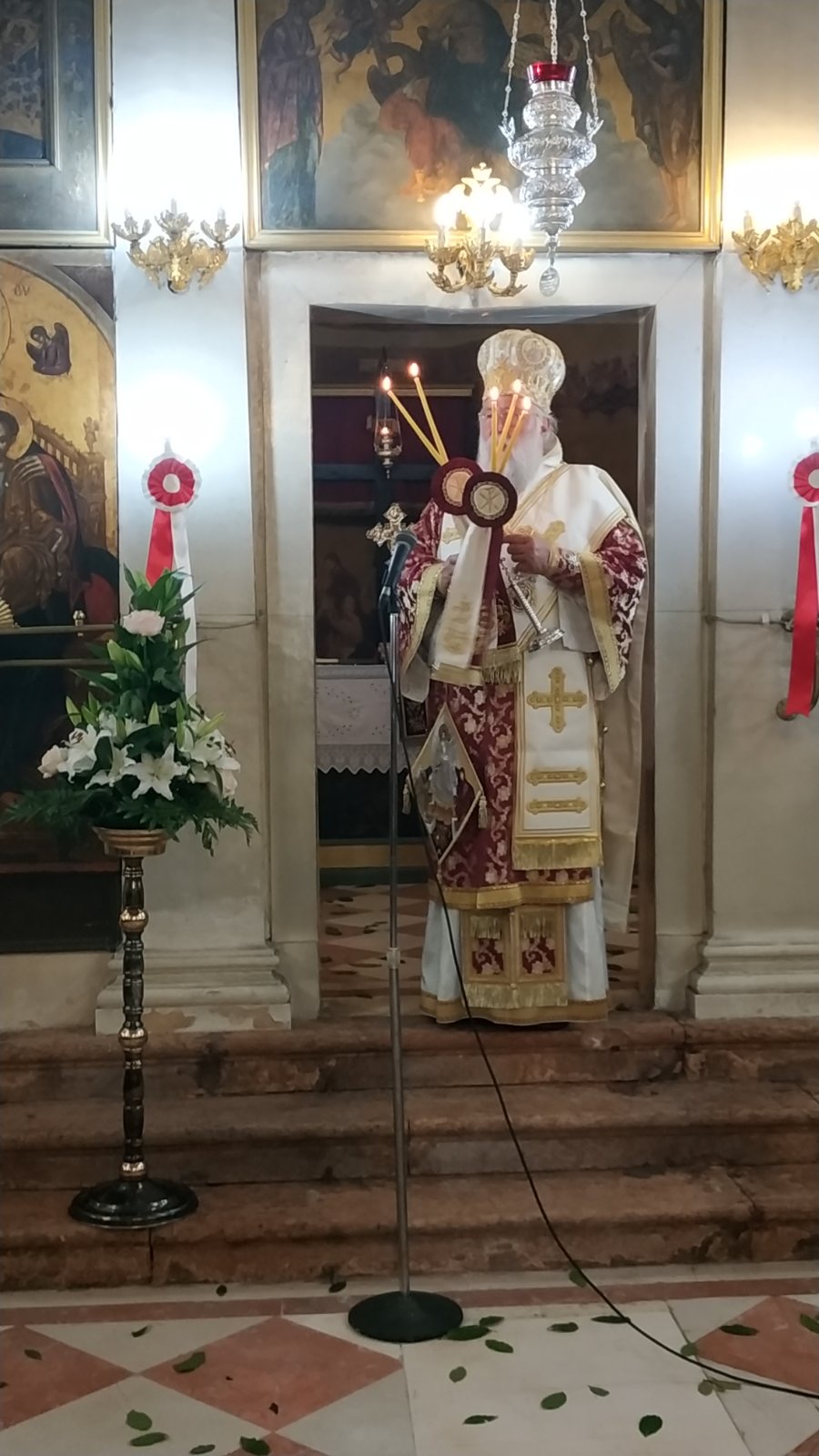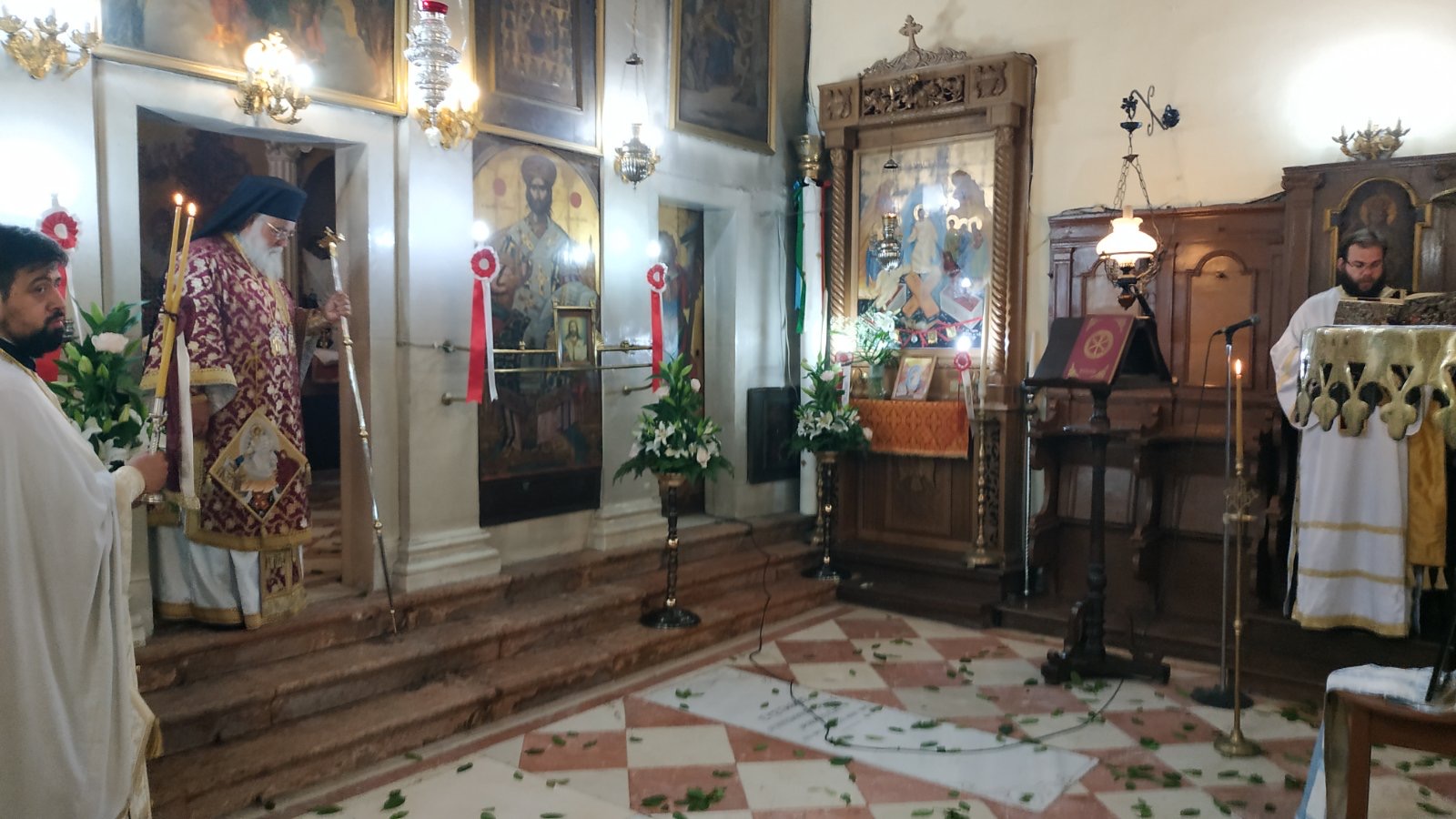 Στο πέρας της Θείας Λειτουργίας ο κ. Νεκτάριος τέλεσε τρισάγιο για την ανάπαυση των ψυχών των μακαριστών προκατόχων του Χρυσάνθου και Ευσταθίου, που είναι θαμμένοι εντός του ναού, όπως συνηθιζόταν στην Κέρκυρα, ενώ προεξήρχε μικρής περιφοράς της εικόνας της Αναστάσεως εντός του κοιμητηρίου και τέλεσε την απόλυση μπροστά από το κενοτάφιο του Αγίου Αρσενίου του Καππαδόκου, ο οποίος είχε κοιμηθεί και είχε ταφεί στην Κέρκυρα, μετά την ανταλλαγή των πληθυσμών ύστερα από την Μικρασιατική καταστροφή.