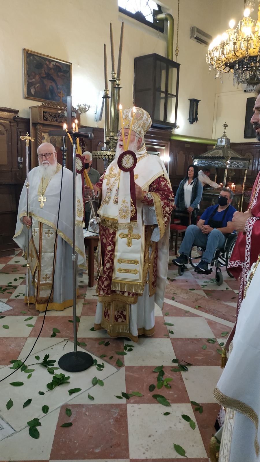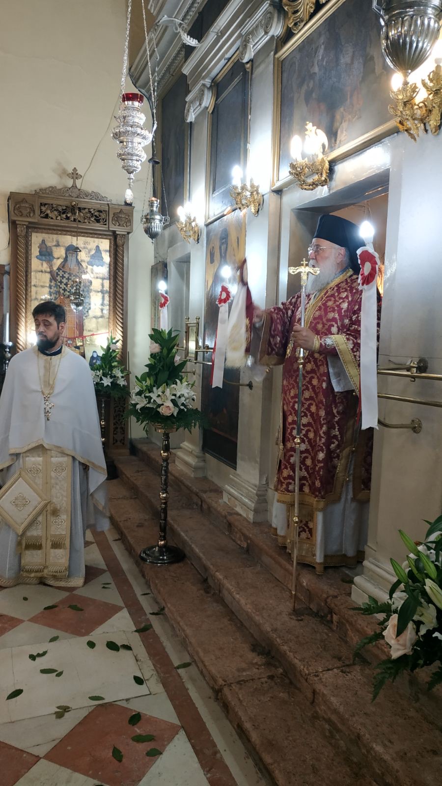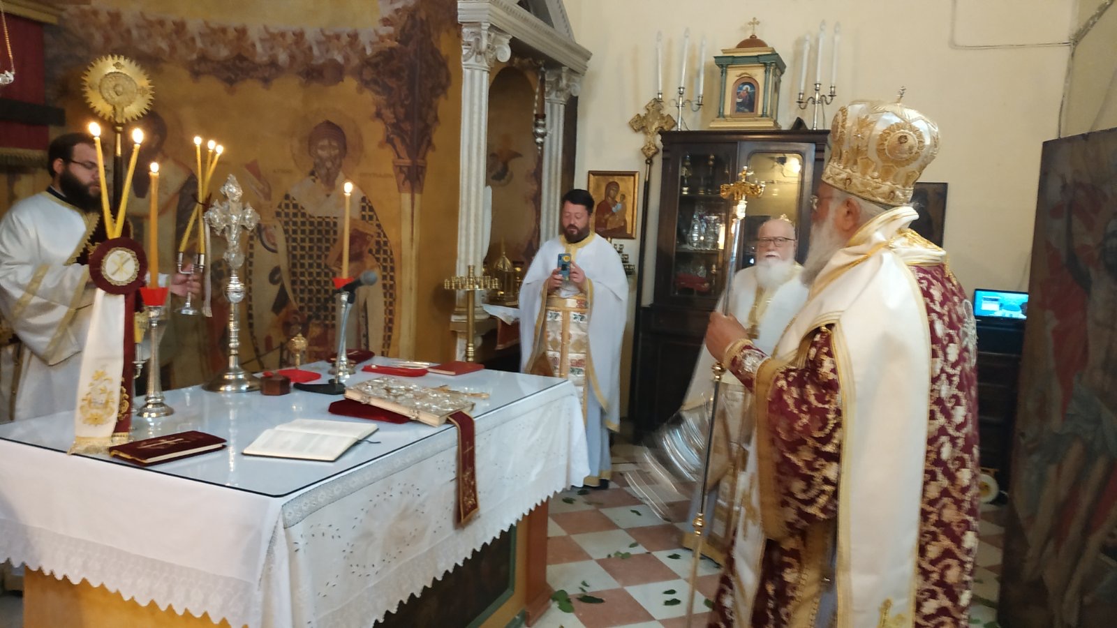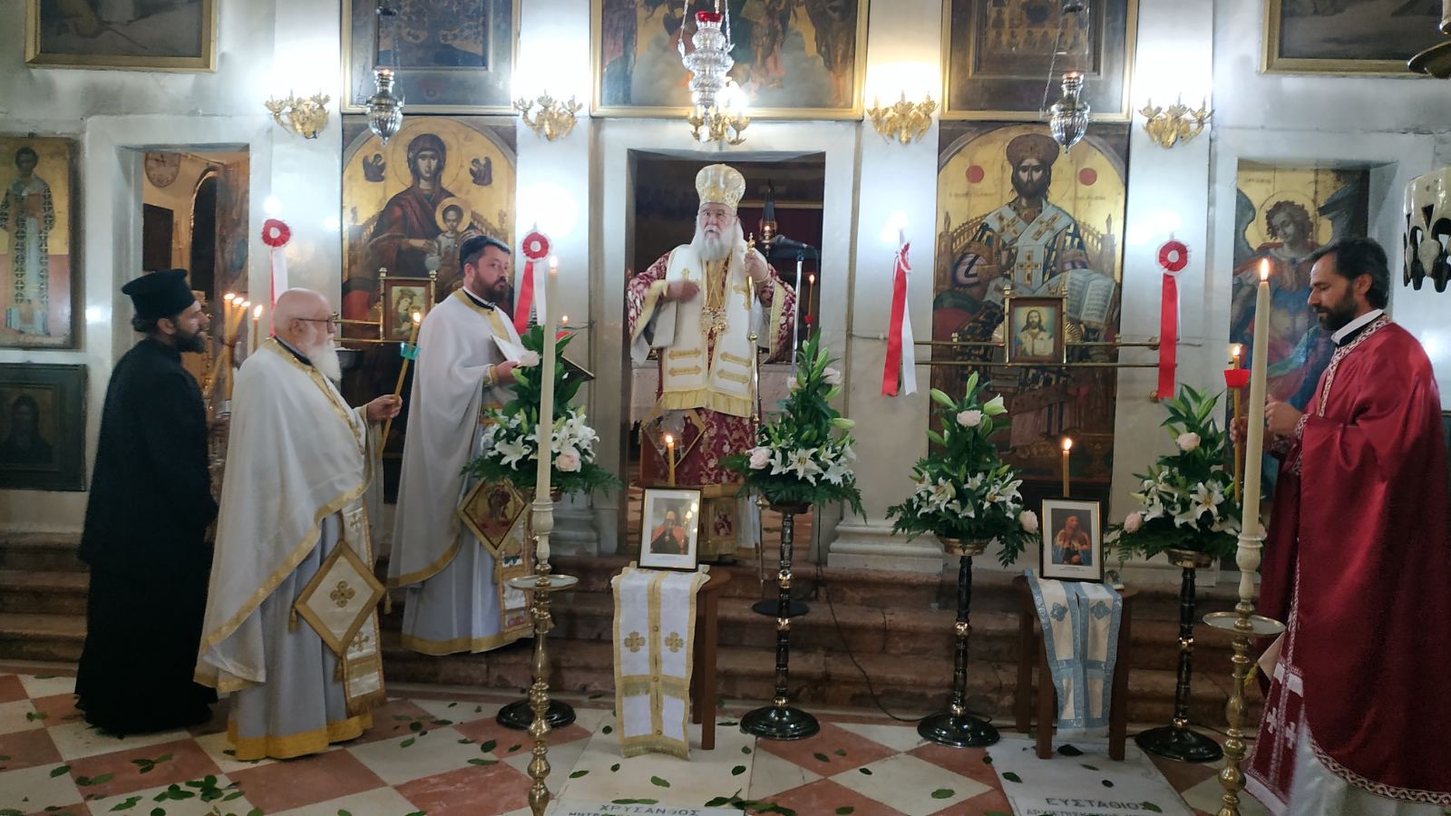 Στο πέρας της Θείας Λειτουργίας ο κ. Νεκτάριος τέλεσε τρισάγιο για την ανάπαυση των ψυχών των μακαριστών προκατόχων του Χρυσάνθου και Ευσταθίου, που είναι θαμμένοι εντός του ναού, όπως συνηθιζόταν στην Κέρκυρα, ενώ προεξήρχε μικρής περιφοράς της εικόνας της Αναστάσεως εντός του κοιμητηρίου και τέλεσε την απόλυση μπροστά από το κενοτάφιο του Αγίου Αρσενίου του Καππαδόκου, ο οποίος είχε κοιμηθεί και είχε ταφεί στην Κέρκυρα, μετά την ανταλλαγή των πληθυσμών ύστερα από την Μικρασιατική καταστροφή.