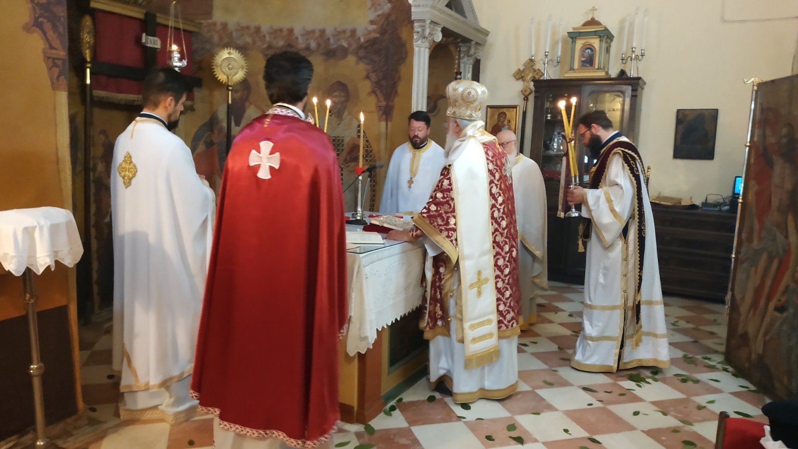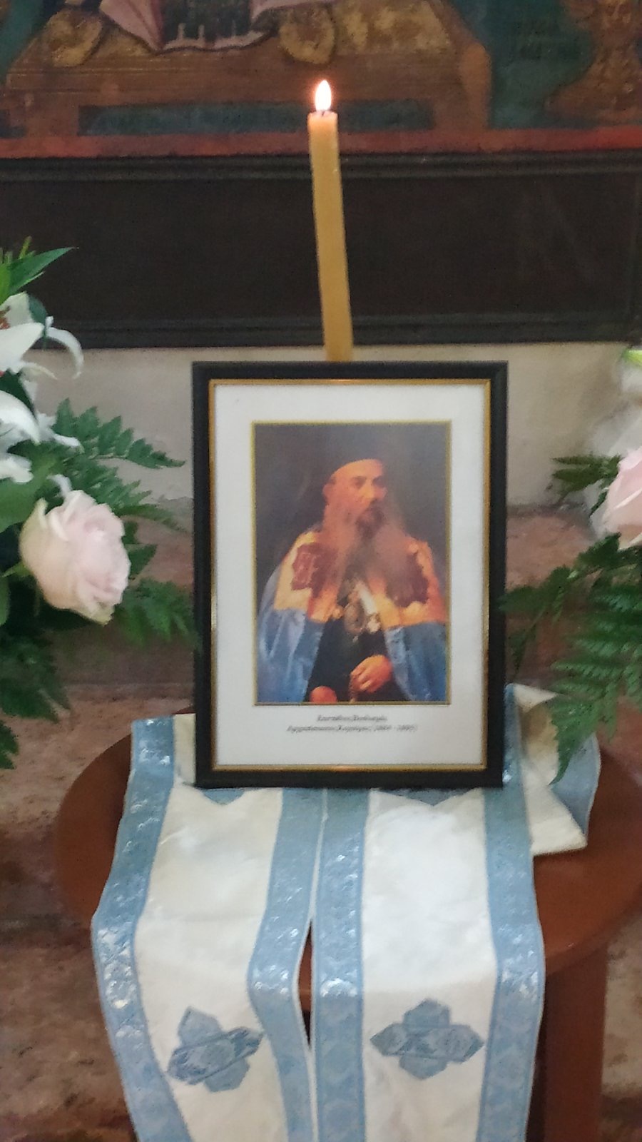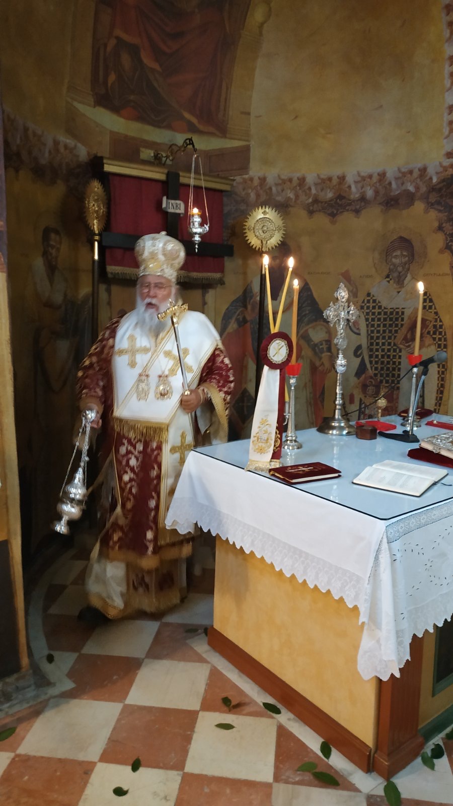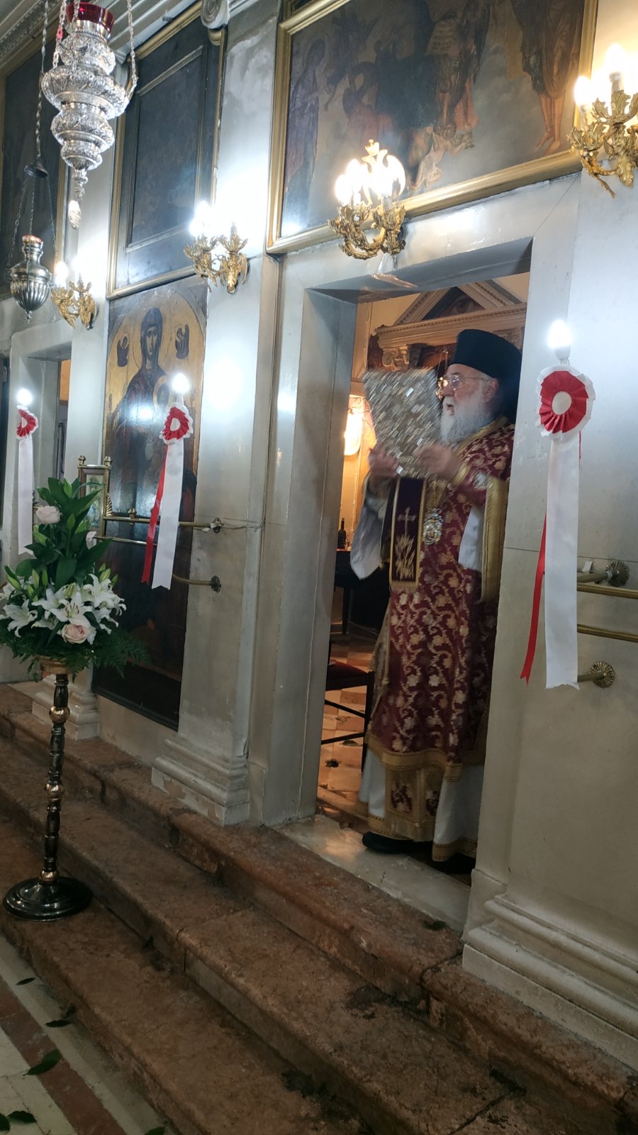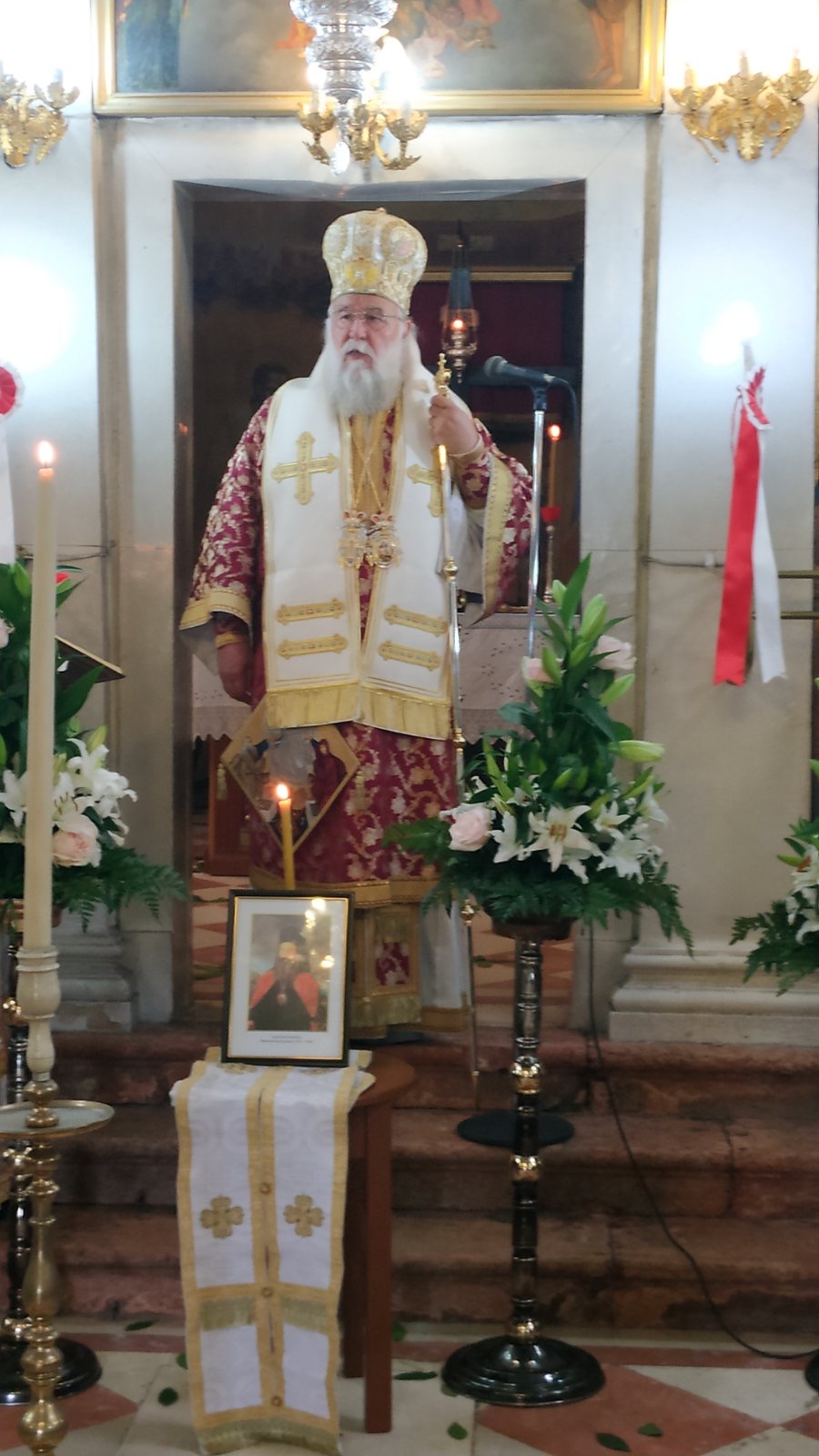Στο πέρας της Θείας Λειτουργίας ο κ. Νεκτάριος τέλεσε τρισάγιο για την ανάπαυση των ψυχών των μακαριστών προκατόχων του Χρυσάνθου και Ευσταθίου, που είναι θαμμένοι εντός του ναού, όπως συνηθιζόταν στην Κέρκυρα, ενώ προεξήρχε μικρής περιφοράς της εικόνας της Αναστάσεως εντός του κοιμητηρίου και τέλεσε την απόλυση μπροστά από το κενοτάφιο του Αγίου Αρσενίου του Καππαδόκου, ο οποίος είχε κοιμηθεί και είχε ταφεί στην Κέρκυρα, μετά την ανταλλαγή των πληθυσμών ύστερα από την Μικρασιατική καταστροφή.