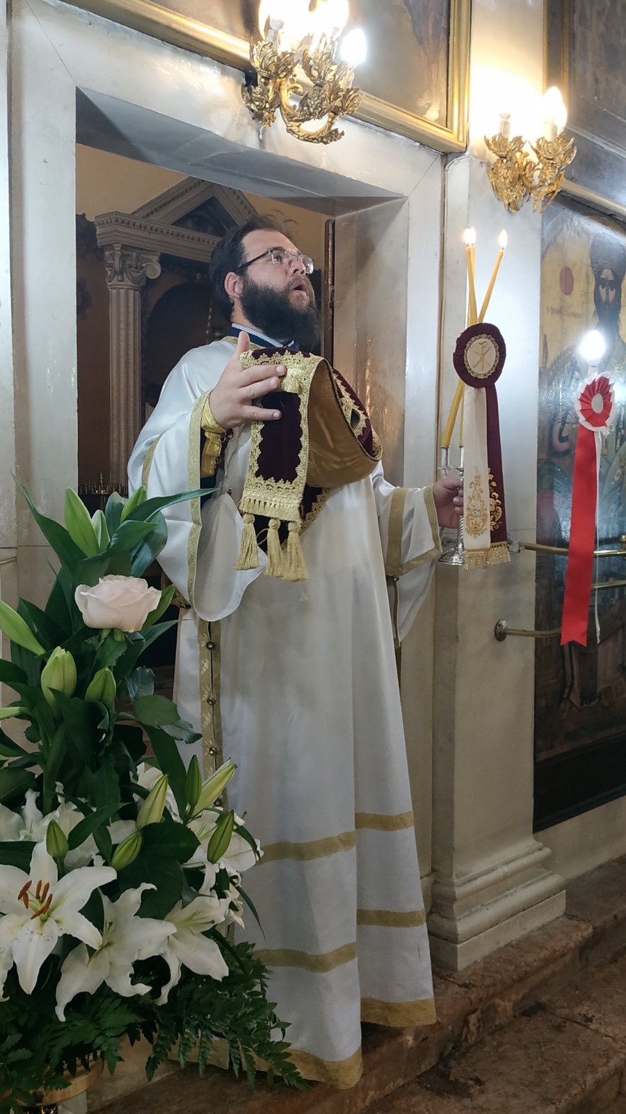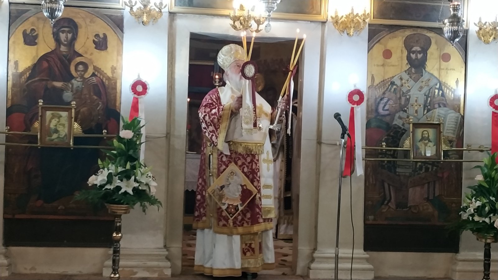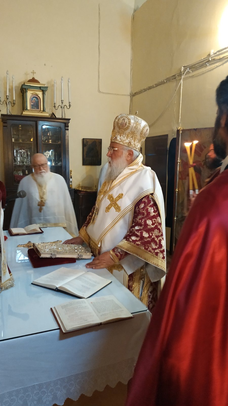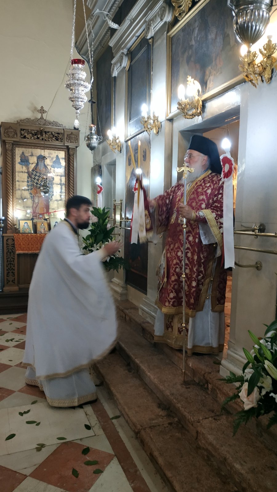 Στο πέρας της Θείας Λειτουργίας ο κ. Νεκτάριος τέλεσε τρισάγιο για την ανάπαυση των ψυχών των μακαριστών προκατόχων του Χρυσάνθου και Ευσταθίου, που είναι θαμμένοι εντός του ναού, όπως συνηθιζόταν στην Κέρκυρα, ενώ προεξήρχε μικρής περιφοράς της εικόνας της Αναστάσεως εντός του κοιμητηρίου και τέλεσε την απόλυση μπροστά από το κενοτάφιο του Αγίου Αρσενίου του Καππαδόκου, ο οποίος είχε κοιμηθεί και είχε ταφεί στην Κέρκυρα, μετά την ανταλλαγή των πληθυσμών ύστερα από την Μικρασιατική καταστροφή.