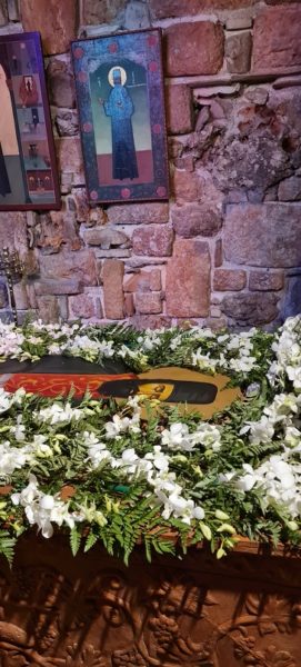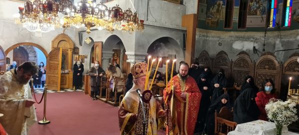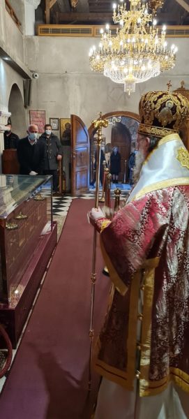Μετά το πέρας της Θείας Λειτουργίας, και την τέλεση Μνημοσύνου υπέρ αναπαύσεως της ψυχής της αειμνήστης πρώτης Καθηγουμένης και Κτητορίσσης της Ιεράς Μονής Μοναχής Μακαρίας Δεσύπρη, σχηματίστηκε Λιτανευτική πομπή με την συμμετοχή και της Γυναικείας Μοναχικής Αδελφότητος προς το Παρεκκλήσιο της ευρέσεως, το οποίο ευρίσκεται εντός του Καθολικού της Ιεράς Μονής όπου αναπέμφθηκαν δεήσεις υπέρ της Αδελφότητος, των ευλαβών προσκυνητών, των ασθενούντων υπό της λοιμικής ασθενείας του κορονοϊού και ταχείας απαλλάγης από της πανδημίας.