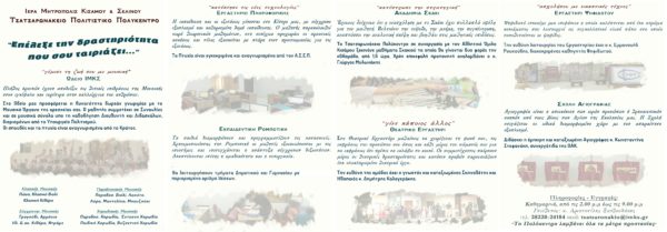 Ε. ΘΕΑΤΡΙΚΟ ΕΡΓΑΣΤΗΡΙ Για παιδιά, έφηβους και νέους. Οι συμμετέχοντες παίρνουν μέρος σε θεατρικές δραστηριότητες και παρουσιάζουν ολοκληρωμένο θεατρικό έργο. Υπεύθυνος ομάδας ο γνωστός και καταξιωμένος Σκηνοθέτης και Ηθοποιός κ. Δημήτρης Καλογεράκης.
