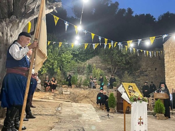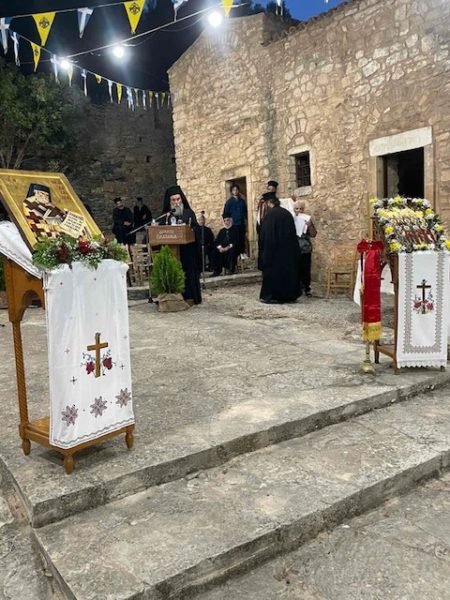 Με ιδιαίτερη αναφορά στον Άγιο Νικόδημο τον Αγιορείτη ως επίσης και σε πρόσωπα Νεομαρτύρων πως το παράδειγμα τους έγινε «φως και άναψε την φλόγα της επανάστασης», όπως σημείωσε στον εμπνευσμένο λόγο του. Ακολούθως αναφέρθηκε εις το πρόσωπο του αγίου Εθνοϊερομάρτυρα Μελχισεδέκ, Επισκόπου Κισάμου και Σελίνου. Χαιρετισμούς απεύθυναν οι συνδιοργανωτές, οι οποίοι αναφέρθηκαν στο νόημα και την αξία των επετειακών αυτών εορτασμών. Την εκδήλωση έκλεισε ο Σεβασμιώτατος, ο οποίος, με λόγους θερμούς χαιρέτισε και ευχαρίστησε τόσο τους συνδιοργανωτές, όσο και τον εκλεκτό ομιλητή, ως και όλους τους συντελεστές και παρευρισκομένους, τον Αρχ. Επίτροπο Ανατολικής Κισάμου Αιδ. Πρωτ. π. Ιωάννη Γουμενάκη, τους Ιερείς της περιοχής ως και τους Συλλόγους δια τις προσφορές των καρπών της γης. Τον Καθηγούμενο π. Ιερεμία δια την προσφορά της Εικόνας ως και τον Πολιτιστικό Σύλλογο «Ρόδο», σημειώνοντας: «Προσκυνητές σήμερα σε αυτό τον τόπο, τον ιερό, τον άγιο που μαρτυρεί την ιστορία, τον πολιτισμό, την ταυτότητα μας, φωτίζοντας και σηματοδοτώντας το παρελθόν και το παρόν. Διερωτώμαι, άραγε και το μέλλον; Τέτοιου είδους εορτασμοί αποκτούν νόημα και ουσία όταν αποτελούν νέο εγερτήριο θούριο, αφυπνίζουν συνειδήσεις και δεν εγκλωβίζονται σε στείρες επετειακές εκδηλώσεις. Εάν θρηνούμε και όντως θρηνούμε τις μέρες αυτές πάνω από τα αποκαΐδια της πύρινης λαίλαπας που έκαψε όχι μόνο τις περιουσίες, τον βιό, εκατοντάδων συνανθρώπων μας, αλλά τα όνειρα και τις ζωές τους, ας μην επιτρέψουμε, εξ΄ αιτίας του ωχαδερφισμού και της ραθυμίας μας, να θρηνήσουμε και πάνω από τα αποκαΐδια του πολιτισμού, της ιστορίας και της ταυτότητας μας», κατέληξε ο Σεβασμιώτατος, ο οποίος ευχήθηκε «Καλή Παναγιά».
