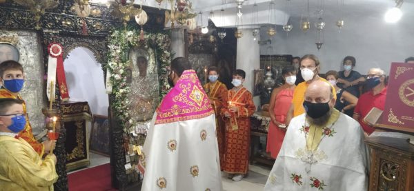 Φέτος, λόγω των ιδιαίτερων συνθηκών δεν πραγματοποιήθηκε η τράπεζα της Παναγίας. Χθες τελέστηκε η ακολουθία του πανηγυρικού εσπερινού με τα εγκώμια και το κόλλυβο της Παναγίας, προεξάρχοντος του Σεβασμιωτάτου.
