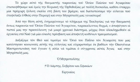 Ένα θαυμαστό γεγονός εξιστορείται ο Σεβασμιώτατος Μητροπολίτης Λάμπης, Συβρίτου και Σφακείων κ. Ειρηναίος με μια ανάγλυφη Εικόνα του Οσίου Παϊσίου μιας οικογένειας η οποία έτρεχε μύρο.