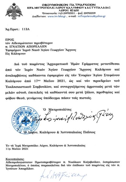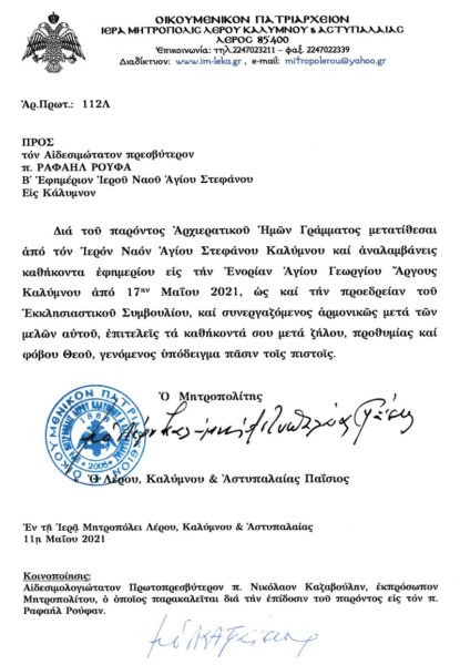 Συγκεκριμένα, ο Σεβασμιώτατος Μητροπολίτης Λέρου, Καλύμνου και Αστυπαλαίας κ. Παΐσιος, προέβη στις κάτωθι αποφάσεις οι οποίες αφορούν: