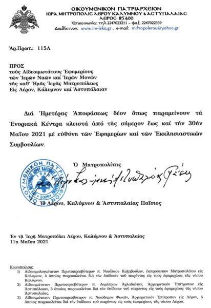 γ) κλείσιμο των Ενοριακών Κέντρων της Ιεράς Μητροπόλεως σε όλα τα νησιά της Επαρχίας μέχρι τέλος του μηνός Μαΐου.