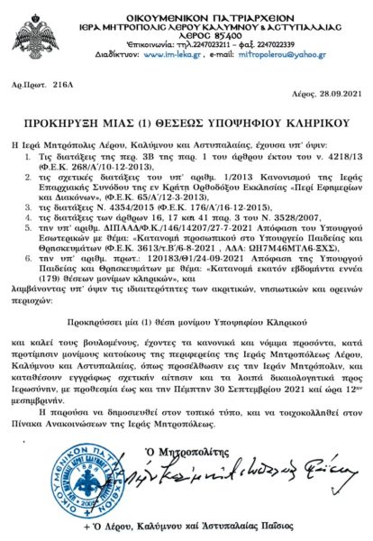 Μία θέση (1) υποψηφίου κληρικού προκηρύσσει η Ιερά Μητρόπολη Λέρου, Καλύμνου και Αστυπάλαιας, συμφώνως με την παρακάτω δημοσιευθείσα Προκήρυξη: