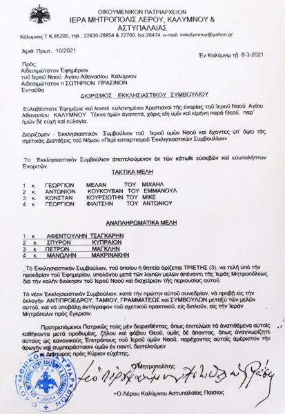 Ο Σεβασμιώτατος Μητροπολίτης Λέρου, Καλύμνου και Αστυπάλαιας κ. Παΐσιος, διόρισε νέο Εκκλησιαστικό Συμβούλιο στον Ενοριακό Ιερό Ναό Αγίου Αθανασίου Καλύμνου, υπό την προεδρία του αιδεσιμωτάτου π. Σωτηρίου Πράσινου με το υπ’ αριθ. πρωτ. 10/8-3-2021 Διοριστήριον.