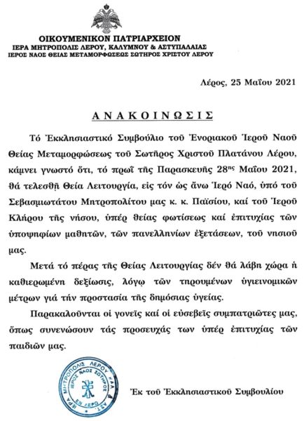 Θεία Λειτουργία υπέρ θείας φωτίσεως και επιτυχίας των υποψηφίων μαθητών των πανελληνίων εξετάσεων θα τελέσει, την Παρασκευή 28 Μαϊου, ο Μητροπολίτης Λέρου κ. Παϊσιος στον Ιερό Ναό Μεταμορφώσεως του Σωτήρος Χριστού Πλατάνου Λέρου.