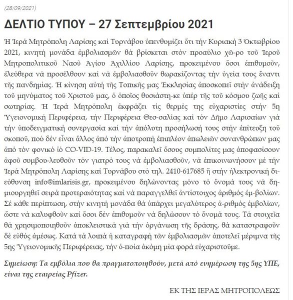 Η Ιερά Μητρόπολη Λαρίσης και Τυρνάβου ανακοίνωσε ότι την Κυριακή 3 Οκτωβρίου 2021, κινητή μονάδα εμβολιασμών θα βρίσκεται στον προαύλιο χώρο του Ιερού Μητροπολιτικού Ναού Αγίου Αχιλλίου Λαρίσης, προκειμένου όσοι επιθυμούν, ελεύθερα να προσέλθουν και να εμβολιασθούν.