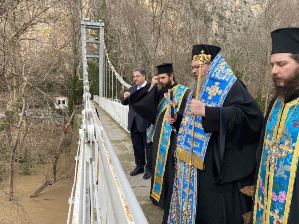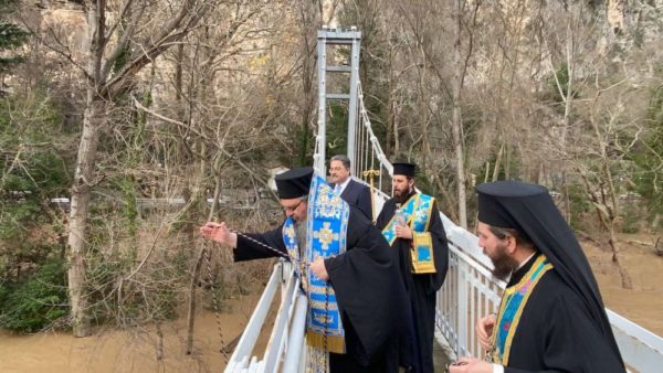 Ανήμερα της Μεγάλης Δεσποτικής Εορτής των Θεοφανείων και μετά το τέλος της Αρχιερατικής Θείας Λειτουργίας και του Μεγάλου Αγιασμού εντός του Μητροπολιτικού Ιερού Ναού Αγίου Αχιλλίου ο Σεβασμιώτατος Μητροπολίτης Λαρίσης και Τυρνάβου κ. Ιερώνυμος συνοδευόμενος υπό του Πανοσιολ. Αρχιμ. κ. Ιγνατίου Μουρτζανού, Πρωτοσυγκέλλου της Ιεράς Μητροπόλεώς μας, μετέβη στο κλειστό από 19 Νοεμβρίου 2019 Ιερό Προσκύνημα Αγίας Παρασκευής Τεμπών και επί της εκεί κρεμαστής γέφυρας τέλεσε τον Αγιασμό των Υδάτων του ποταμού Πηνειού.