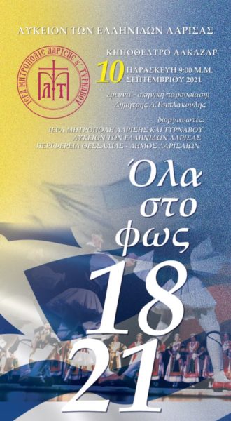 Το Λύκειο των Ελληνίδων, σε συνεργασία με την Ιερά Μητρόπολη Λαρίσης και Τυρνάβου, την Περιφέρεια Θεσσαλίας και τον Δήμο Λαρισαίων, κρίνοντας ότι ο εορτασμός των 200 χρόνων από την Επανάσταση του 1821 αποτελεί μείζον γεγονός, παρουσιάζει την παράσταση «1821, Όλα στο φως», την Παρασκευή 10 Σεπτεμβρίου 2021, ώρα 9 μ.μ., στο Κηποθέατρο.