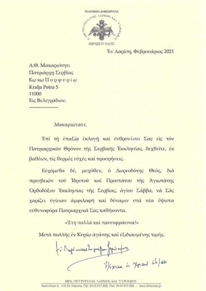 Συγχαρητήρια Μητρ. Λαρίσης στον νέο Πατριάρχη Σερβίας