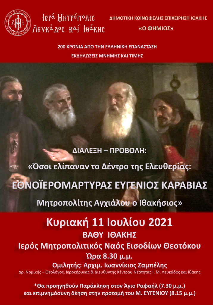 Ἀκολούθως, ὥρα 8.30 μ.μ. ὁ Ἱεροκῆρυξ τῆς Ἱ. Μητροπόλεώς μας, Ἀρχιμ. Ἰωαννίκιος Ζαμπέλης θά παρουσιάσει διάλεξη – προβολή μέ θέμα: «Ὅσοι ἐλίπαναν τό Δέντρο τῆς Ἐλευθερίας: Ἐθνοϊερομάρτυρας Εὐγένιος Καραβίας, Μητροπολίτης Ἀγχιάλου ὁ Ἰθακήσιος».