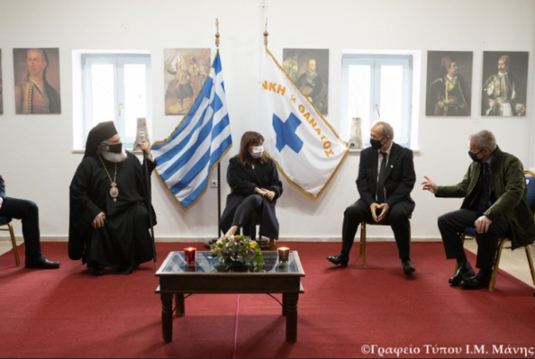 Ο Σεβασμιώτατος, προσέφερε ως δώρο για την επίσκεψή της στη Μάνη, στην κα Πρόεδρο, αντίγραφο της εικόνας των Παμμεγίστων Ταξιαρχών και μια Καινή Διαθήκη.