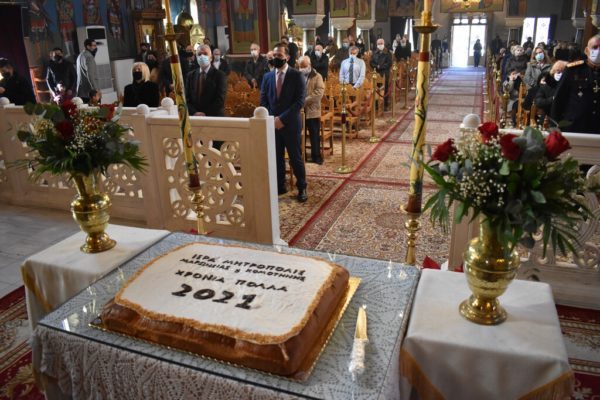Έπειτα ευλόγησε την Πρωτοχρονιάτικη Βασιλόπιτα της Ιεράς Μητροπόλεως και ευχήθηκε σε όλους υγεία ενώ μοίρασε μαζί με το Αντίδωρο και ατομικά βασιλοπιτάκια ως ευλογία.