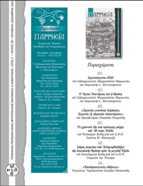 Με πολύ πλούσια και ενδιαφέρουσα θεματολογία κυκλοφόρησε το νέο τεύχος του περιοδικού «Παρρησία» της Ιεράς Μητροπόλεως Μαρωνείας και Κομοτηνής. Στις πρώτες σελίδες του περιοδικού μπορείτε να διαβάσετε για την εορτή των Χριστουγέννων του 2020 (εφόσον πρόκειται για τριμηνιαία έκδοση) σε άρθρο που έγραψε ο Σεβασμιώτατος Μητροπολίτης Μαρωνείας και Κομοτηνής κ. Παντελεήμων, ο οποίος έχει γράψει και ένα ακόμη, με τίτλο «Ο Άγιος Νεκτάριος και η Θράκη».