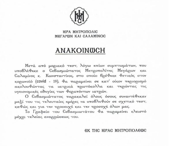 Θετικός στον κορωνοϊό βρέθηκε ο Σεβασμιώτατος Μητροπολίτης Μεγάρων και Σαλαμίνος κ. Κωνσταντίνος κατόπιν υποβολής του σε μοριακό τεστ, στο οποίο και προέβη έχοντας ήπια συμπτώματα.