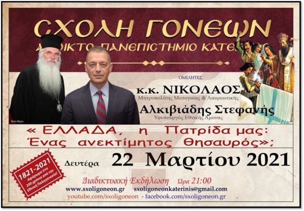 “ΕΛΛΑΔΑ, η Πατρίδα μας: ¨Ένας ανεκτίμητος θησαυρός”; Είναι το θέμα της τελευταίας εκδήλωσης από τις 11 εκδηλώσεις του αφιερώματος της Σχολής Γονέων – Ανοικτό Πανεπιστήμιο Κατερίνης για τα 200 χρόνια από την Εθνική μας Παλιγγενεσία.