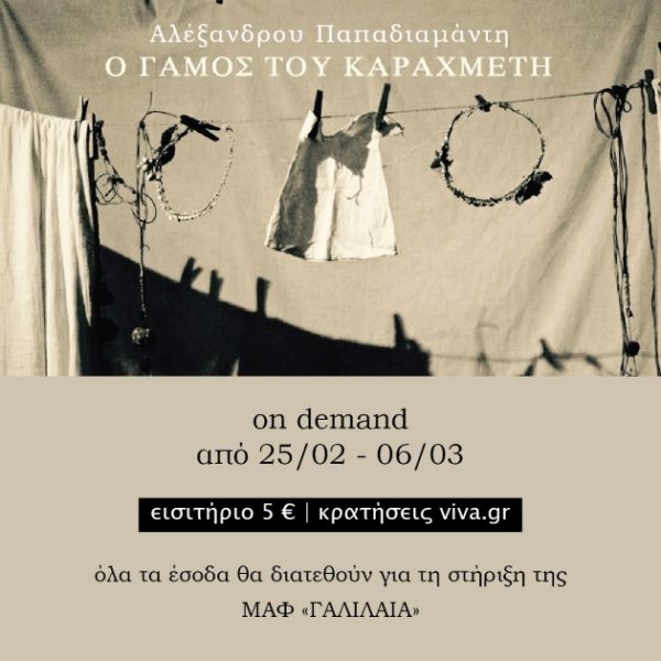 Η Ιερά Μητρόπολη Μεσογαίας και Λαυρεωτικής ανακοίνωσε ότι από 25 Φεβρουαρίου ως και 6 Μαρτίου λαμβάνει αιτήματα κατ’ απαίτηση παρακολούθησης (on demand) του έργου «Ο Γάμος του Καραχμέτη» του Αλέξανδρου Παπαδιαμάντη, σε σκηνοθεσία Όλιας Λαζαρίδου. Όλα τα έσοδα θα διατεθούν στη Μονάδα Ανακουφιστικής Φροντίδας «ΓΑΛΙΛΑΙΑ» (https://galilee.gr/).