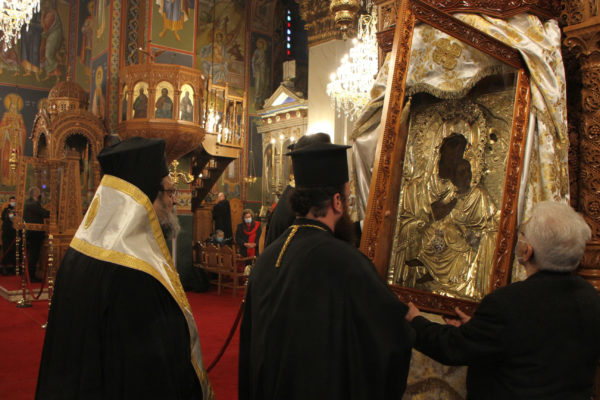 Στη συνέχεια, πραγματοποιήθηκε η ενθρόνιση της Θαυματουργού Εικόνος από το μόνιμο θρόνο της, στο θρόνο λιτανεύσεως Αυτής.