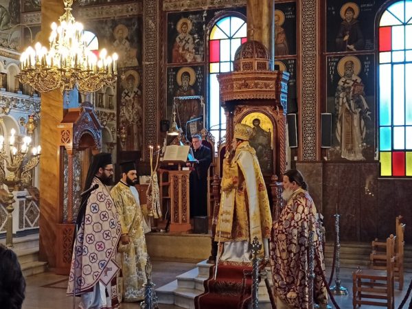 Τον Σεβασμιώτατο πλαισίωσαν οι εφημέριοι του Ναού, Αρχιμ. Αλέξιος Αρώνης και Οικον. Περικλής Τσίχλης και ο Διάκονος της Μητροπόλεως Θεόφιλος Κυριάκος, ενώ τα Ιερά Αναλόγια κόσμησαν οι καλλικέλαδοι Ιεροψάλτες του Ναού Παύλος Δροσάς και Κων. Ζερβάκης.