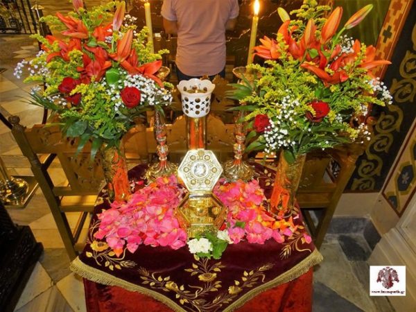 Και στις δύο λατρευτικές συνάξεις εκτέθηκε, για ευλογία και προσκύνηση, απότμημα των ιερών λειψάνων του Αγίου, που φυλάσσεται στην Ιερά Μητρόπολή και το οποίο περιήλθε στην κατοχή του Σεβ. Ποιμενάρχη κατόπιν προσφοράς του τότε Καθηγούμενου της Ιεράς Μονής Σαγματά και νυν Σεβ. Μητροπολίτη Αργολίδος κ. Νεκταρίου.