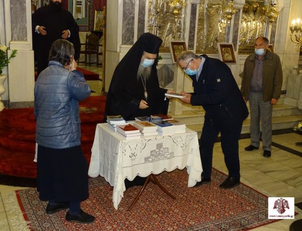 Μετά την ομιλία, ακολούθησε από τον Σεβασμιώτατο η καθιερωμένη διανομή βιβλίων πνευματικής οικοδομής στους παρευρισκόμενους πιστούς με την τήρηση όλων των μέτρων για τον περιορισμό διασποράς του κορωνοϊού.