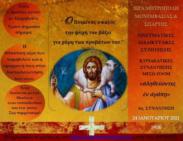 Από την Κυριακή 24 Ιανουαρίου 2021 στις 18.45 θα ξεκινήσει ο θεματικός κύκλος, με τίτλο: «Αληθεύοντες εν αγάπη», όπου έγκριτοι κληρικοί, θεολόγοι και άλλοι αξιόλογοι ομιλητές θα εξετάσουν τις παραβολές του Κυρίου μας. Την προσεχή Κυριακή θα ομιλήσουν ένας θεολόγος, ένας παιδαγωγός και ένας γονέας ερμηνεύοντας την παραβολή του Καλού Ποιμένος και καταθέτοντας επίκαιρους προβληματισμούς.