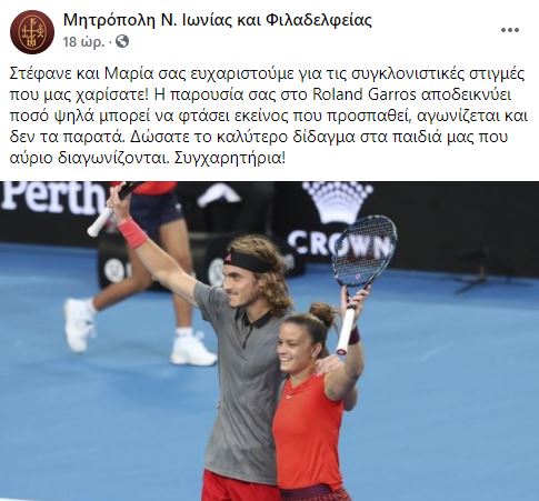 “Στέφανε και Μαρία, σας ευχαριστούμε για τις συγκλονιστικές στιγμές που μας χαρίσατε! Η παρουσία σας στο Roland Garros αποδεικνύει ποσό ψηλά μπορεί να φτάσει εκείνος που προσπαθεί, αγωνίζεται και δεν τα παρατά. Δώσατε το καλύτερο δίδαγμα στα παιδιά μας που αύριο διαγωνίζονται. Συγχαρητήρια!”.