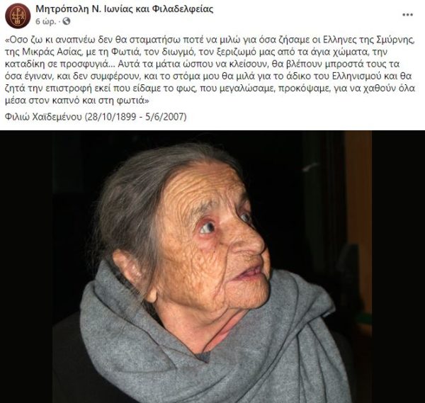 Η Ιερά Μητρόπολη Νέας Ιωνίας και Φιλαδελφείας ενθυμείται και τιμά τη Φιλιώ Χαϊδεμένου (28/10/1899 – 5/6/2007) αναρτώντας τα παρακάτω λόγια της ιδίας: